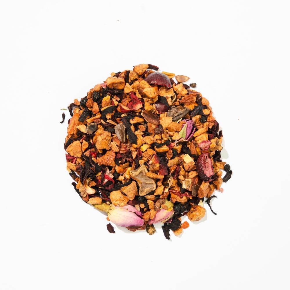 قطع التفاح، أزهار الكركديه، قطع ثمرة الخرنوب، البلسان، براعم الورد، براعم الفاوانيا، شرائح التوت البري، قطع التوت البري.