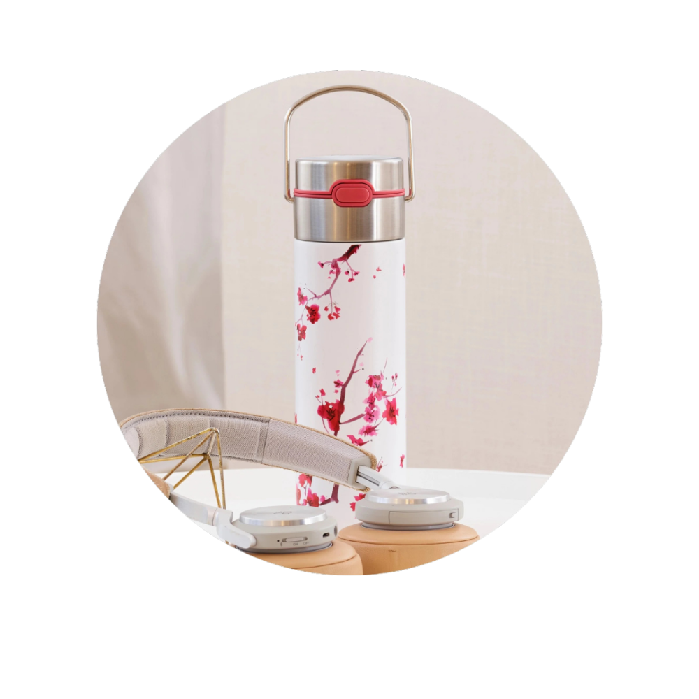 حافظة حرارة مع اطار المزدوج للستليس ستيل مزينة ببراعم الكرز الياباني للمحافظة على دفئ مشروبك و اعطاء جمالية للحافظة